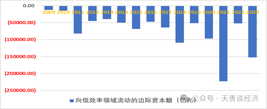 从图5不错看出,2009到2023年,由于四万亿刺激和不屈常的五年,国有经济占一皆企业经济比率飞腾,成本向低后果的领域流动建设,其增长率为1.53%,这一时候的成本产出扫数为55.47%,给国民经济形成了年平均0.84个百分点的负增长。如果后果高领域的成本不向低后果领域流动,这一时候的经济增长不应当是6.95%,而是7.79%。