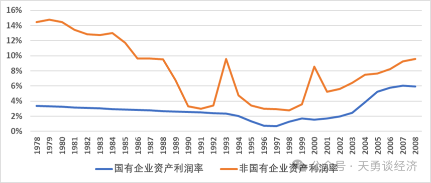 2009到2023年:国有企业资产利润率平均为2.13%,非国有企业为7.83%,比1978到2008折柳下跌0.71和0.25个百分点,二者之间利润差值平均为5.70%,比上期扩大0.43个百分点。